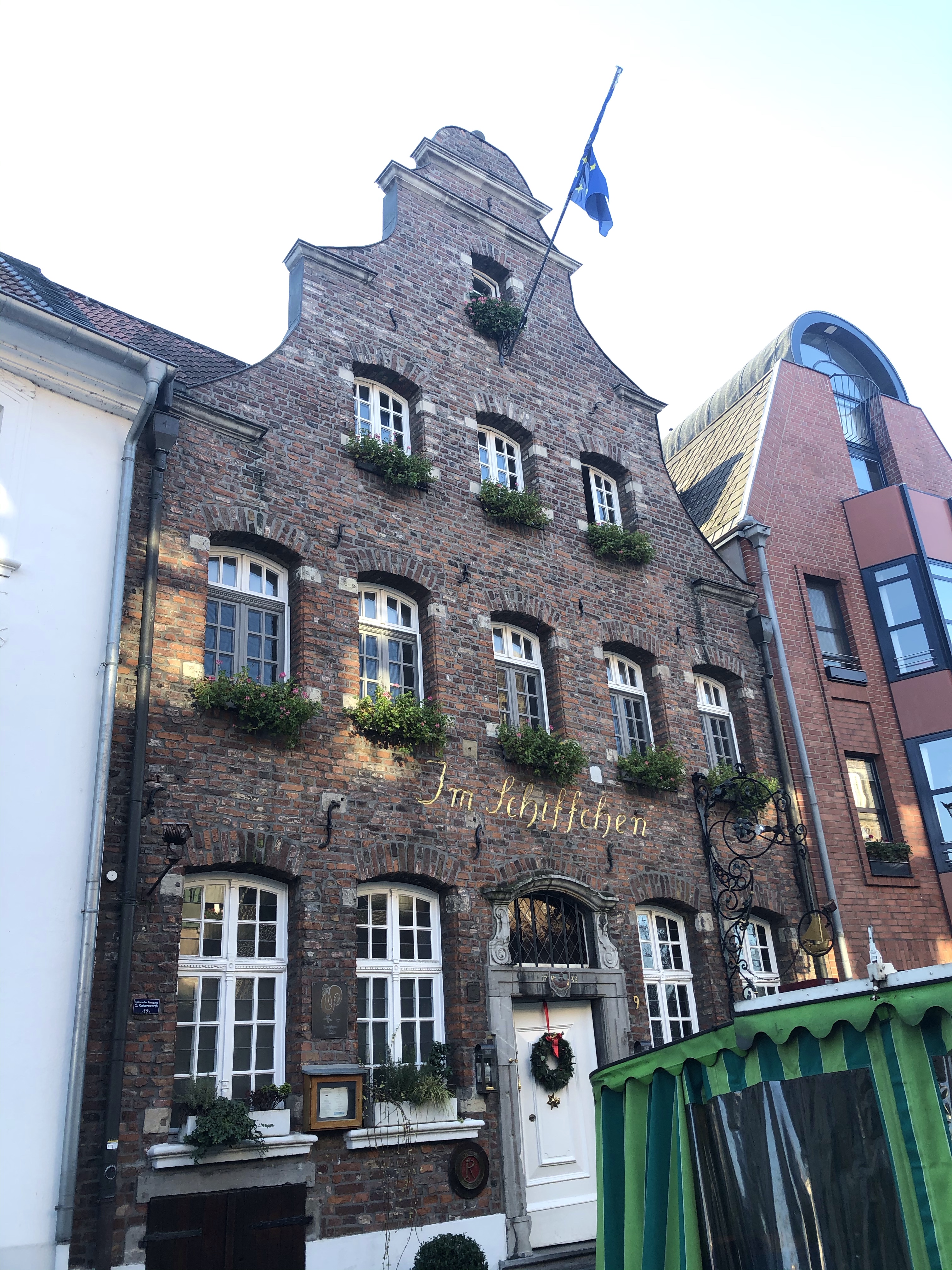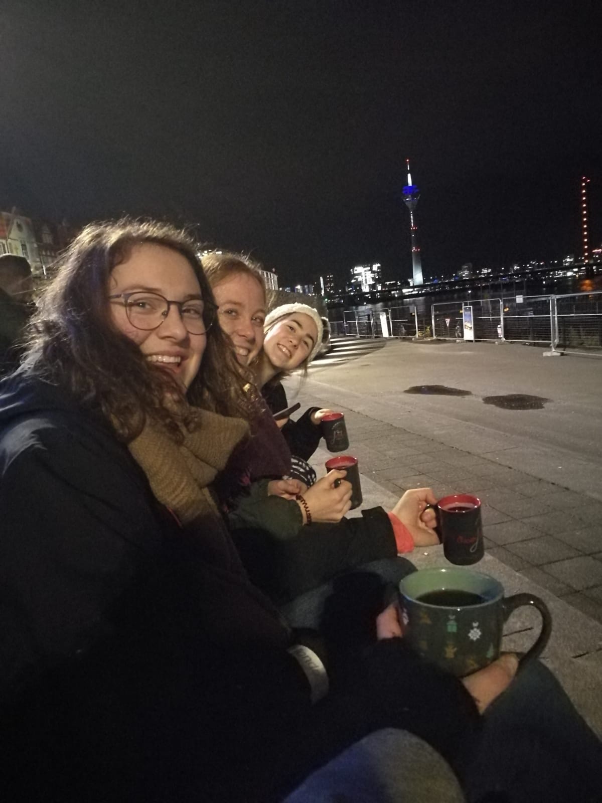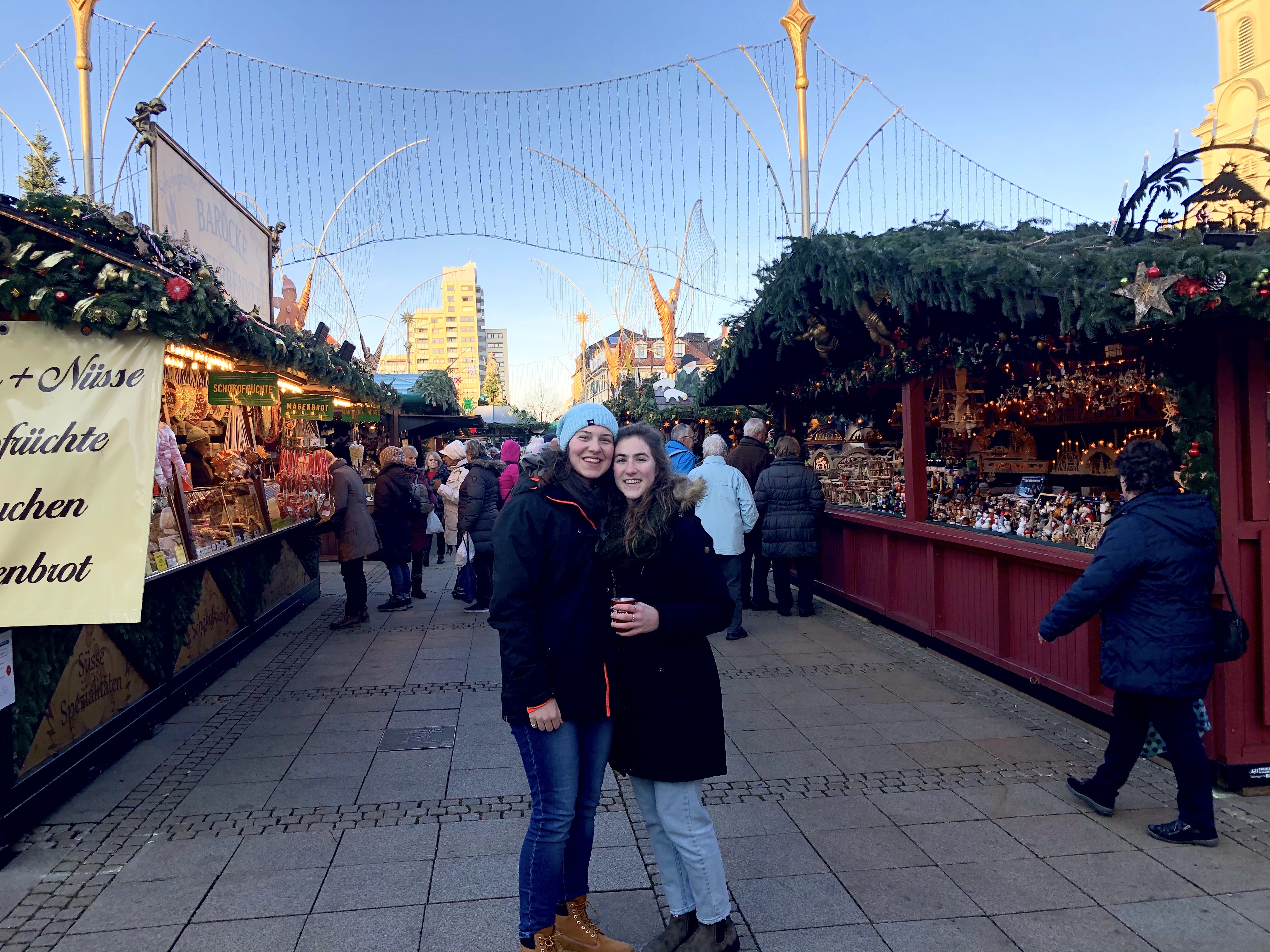 She took us down some streets to see some huge old houses with some crazy architecture and also showed us the main station which was also super massive and beautiful. We biked through a bunch of different parts of the city and past the harbor which is apparently a really important port for bringing goods into Belgium. Next we made a stop at a quirky little coffee shop before going into the main part of the city to see the Christmas market. We locked up the bikes and spent a few hours just wandering around the lit up streets. All the buildings had a ton of Christmas lights and it made it easy to see everything that was happening there even though it was getting dark outside. One thing that Lise told us was a super common thing at Belgian Christmas markets was that you do shots. It was different for Celeste and I because we have both been to a lot of markets in Germany where the big drink that they sell is Glüwein.